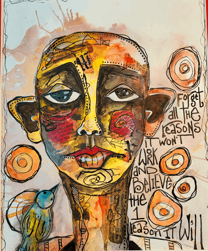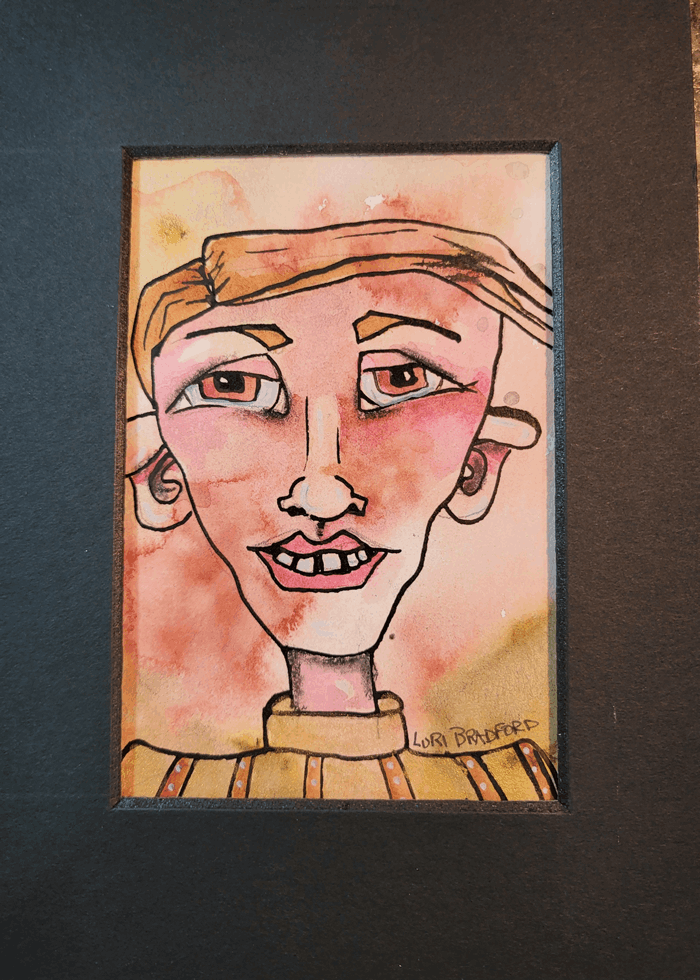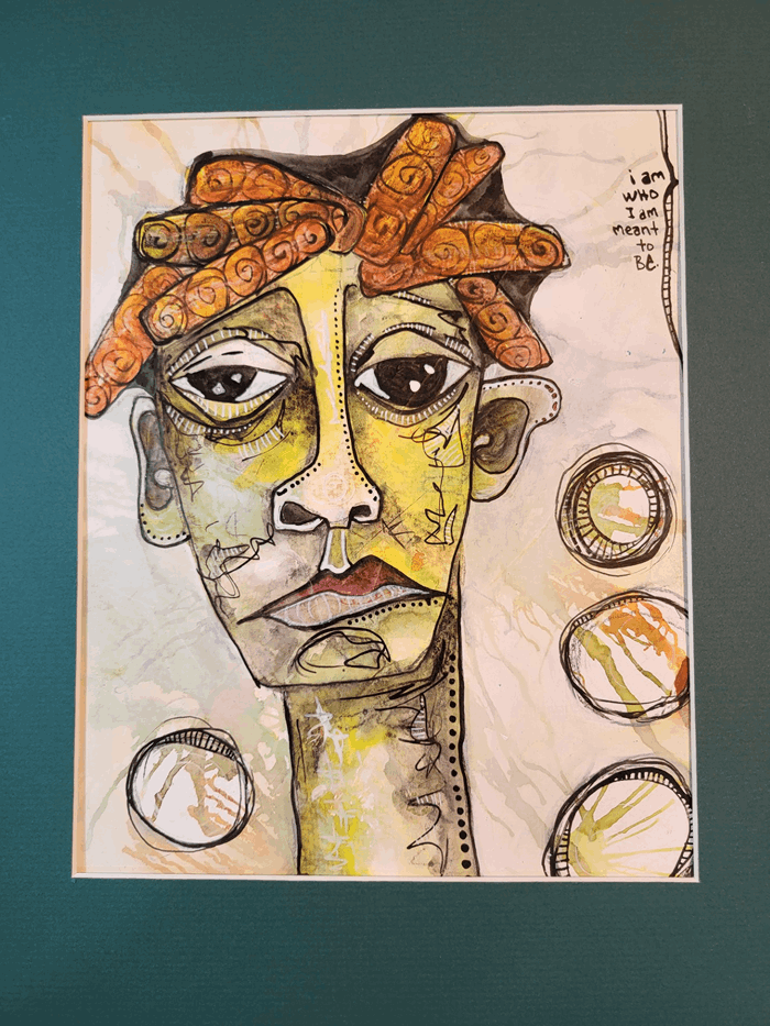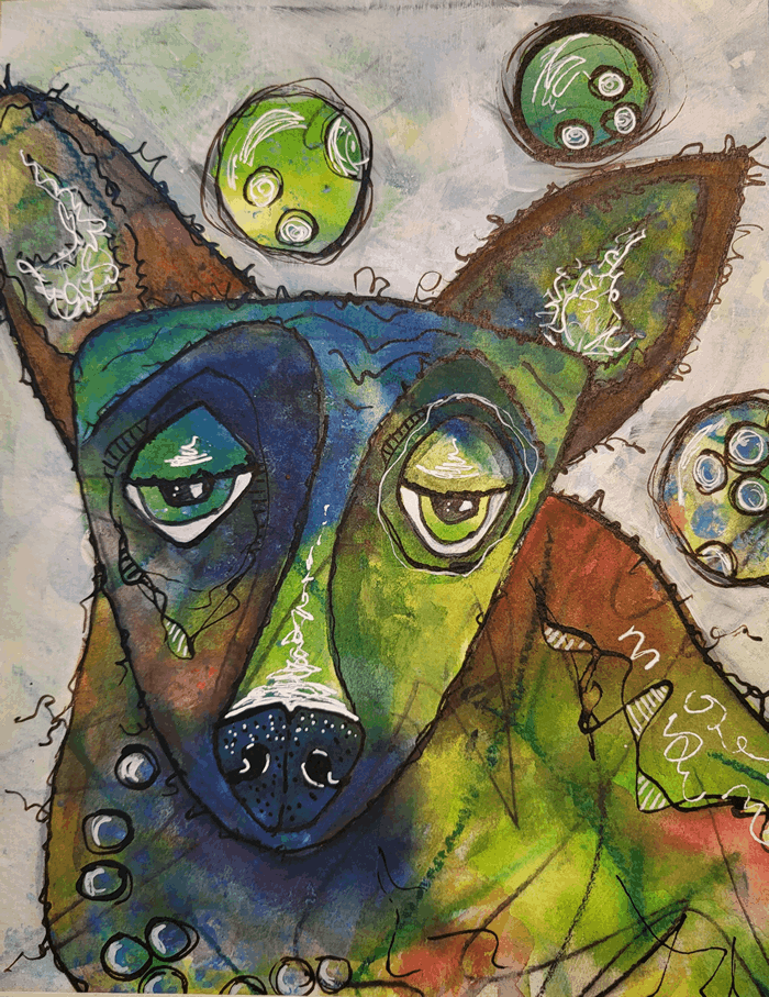 A mesmerizing painting that beckons the viewer into a realm where abstract wonder meets vibrant mystery. The eyes captivate with their expressive depth and hold secrets, inviting contemplation and introspection. Lori's expressive drawing and use of color add unexpected elements.
