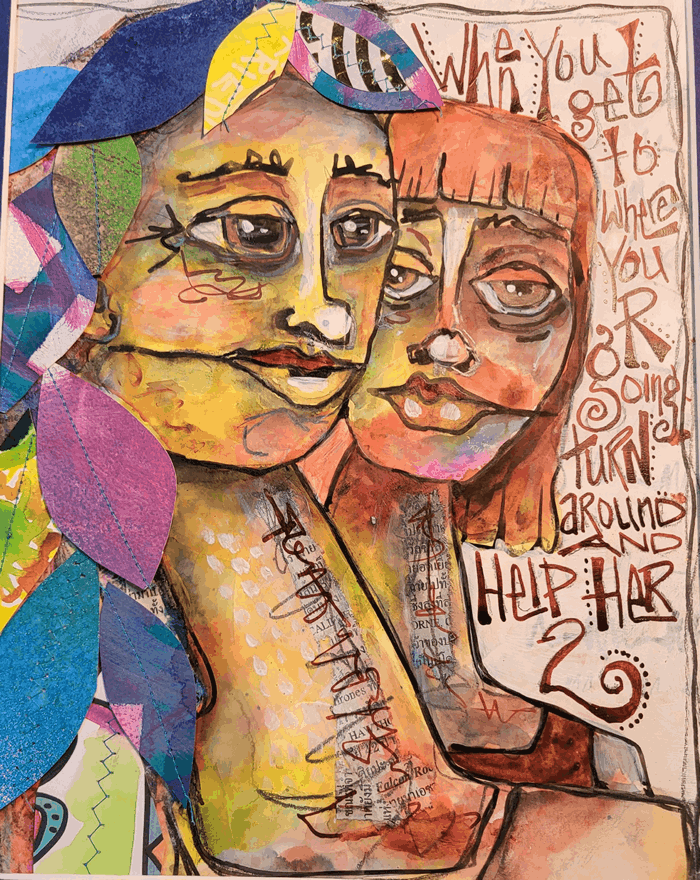 "When you get to where you are going, turn around and help her too." This intricate text is not just a decorative element; it's a heartfelt reminder woven into the artwork, emphasizing empathy and solidarity. The overall effect is one of expressive vitality, where strong lines dance with vibrant colors, sparking both emotion and thought. "Help Her Too" stands as a testimony to compassion and interconnectedness that's sure to captivate and inspire.