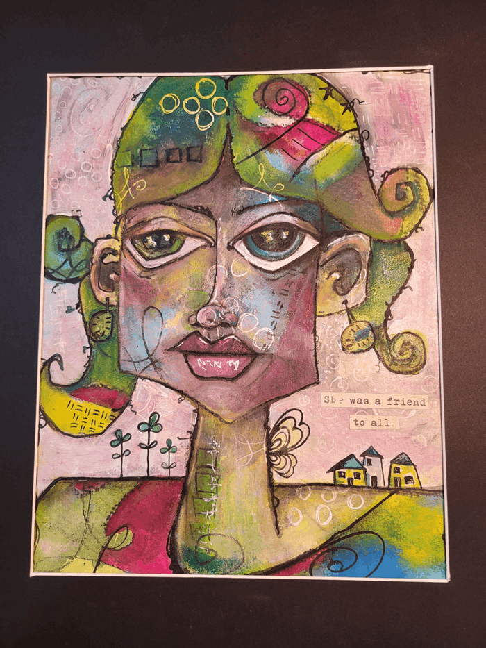 A delightful, vibrant, and colorful portrait that instantly captures the viewer's attention with its playful and whimsical style. The inscription "She was a friend to all." warmly sums up the spirit of the portrait, endearing the character to all who gaze upon her. This enchanting artwork radiates warmth, friendliness, and a touch of magic, inviting viewers to lose themselves in its joyful world.