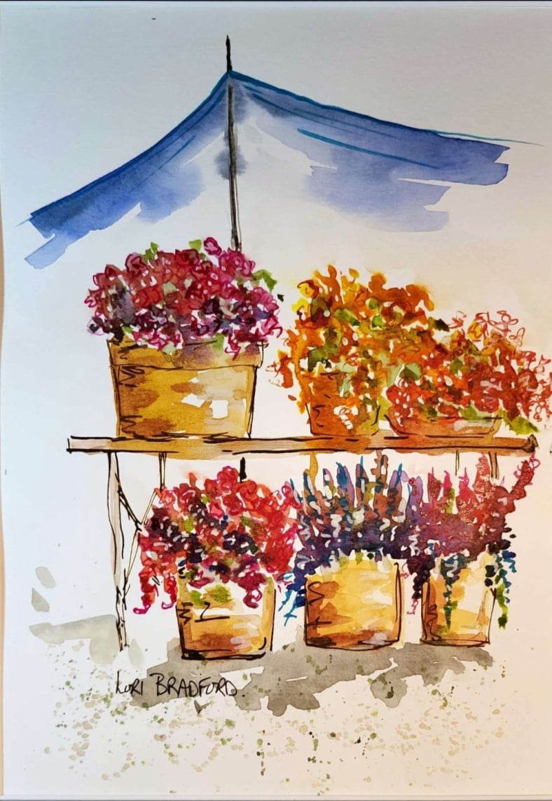 This delightful watercolor painting captures the heart of a bustling market garden, teeming with the fresh flowers ready to brighten anyone's day. This watercolor painting is sure to sprinkle a bit of happiness wherever it finds a home.